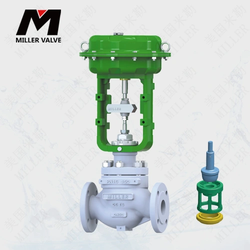 美國米勒進口氣動單座調(diào)節(jié)閥也叫直行程氣動控制閥,美國公司生產(chǎn)的氣動單座調(diào)節(jié)閥采用頂部導(dǎo)向不平衡式結(jié)構(gòu),高強度、重載荷、S 型流道、壓降損失小、流量系數(shù)大、可調(diào)范圍廣、流量特性精度高。該類型調(diào)節(jié)閥適用于工況壓差較小的場合,關(guān)閉嚴(yán)密,適用于對介質(zhì)流量或者壓力的調(diào)節(jié)。閥籠采用壓緊閥座設(shè)計,解決了傳統(tǒng)的螺紋擰入式閥座拆卸困難,泄漏量大等問題,延長了使用壽命。采用流開式設(shè)計,介質(zhì)趨向于閥門開啟的方向,小開度可控性好,流量特性畸變小。根據(jù)工況要求可選擇降噪音、抗氣蝕的特殊閥籠。